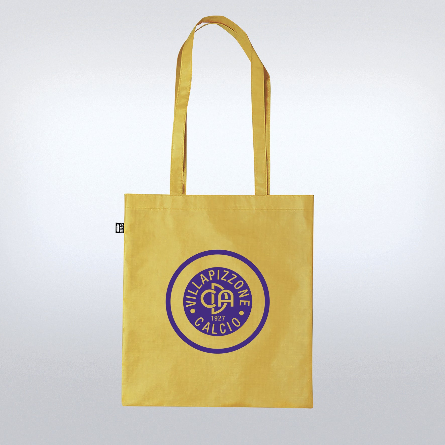 Shopper in materiale RPET, realizzata con plastica riciclata, per promuovere il riutilizzo dei rifiuti plastici e contribuire alla sostenibilità del pianeta. In materiale laminato da 100 g/m2 con finitura opaca, manici lunghi e cuciture rinforzate. Resistente fino a 5 kg di peso. Disponibile in giallo e in 2 soggetti.